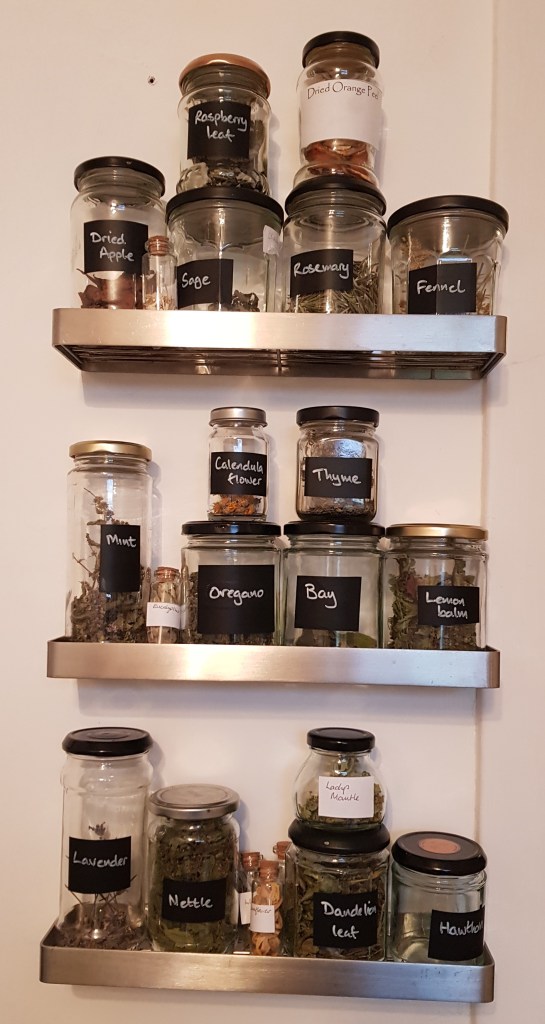 Drying the herbs and leaves for future use is really easy as well. The trick is to be patient, since most herbs can’t tolerate being dried quickly or at high heat, so the best way to dry them is to let them naturally dehydrate in the warm air. Lots of people have a food dehydrator, but I use an adapted toy storage net, hung on the washing line, and then popped inside a warm shed overnight, and this works really well. You can dry them in the oven on a very low heat for a few hours, but I have always found this to need too much of my attention, and I’m basically lazy at heart.